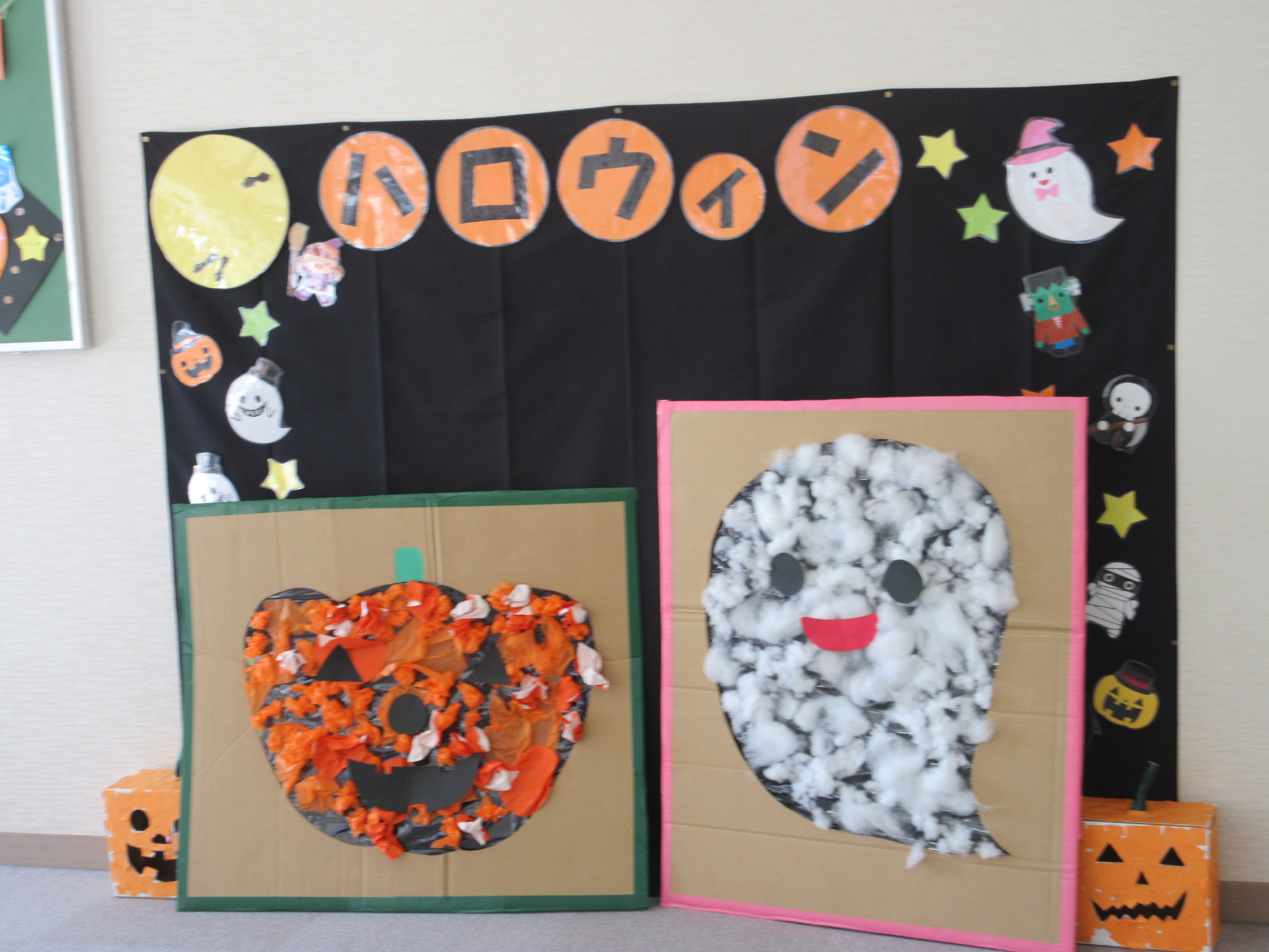 最後は、みんなで「おばけちゃん」と「かぼちゃちゃん」を作りました。