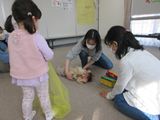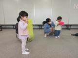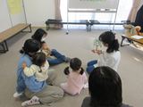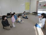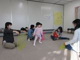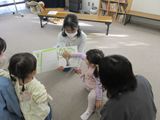 「だるまさんが」「まつぼっくり」「ふしぎなふしぎなまほうの木」の絵本を見せてもらいました。初めてみる絵本に興味津々!えつこ先生が絵本を読む声に合わせて体を動かしたり、絵本に触れたりすることもできました。その後は「に〜ぎりぱっちりたてよこひよこ〜♪」のわらべ歌に合わせてスカーフ遊びもしました。和やかな雰囲気の中、お母さんと一緒にゆったりと遊んでいました。