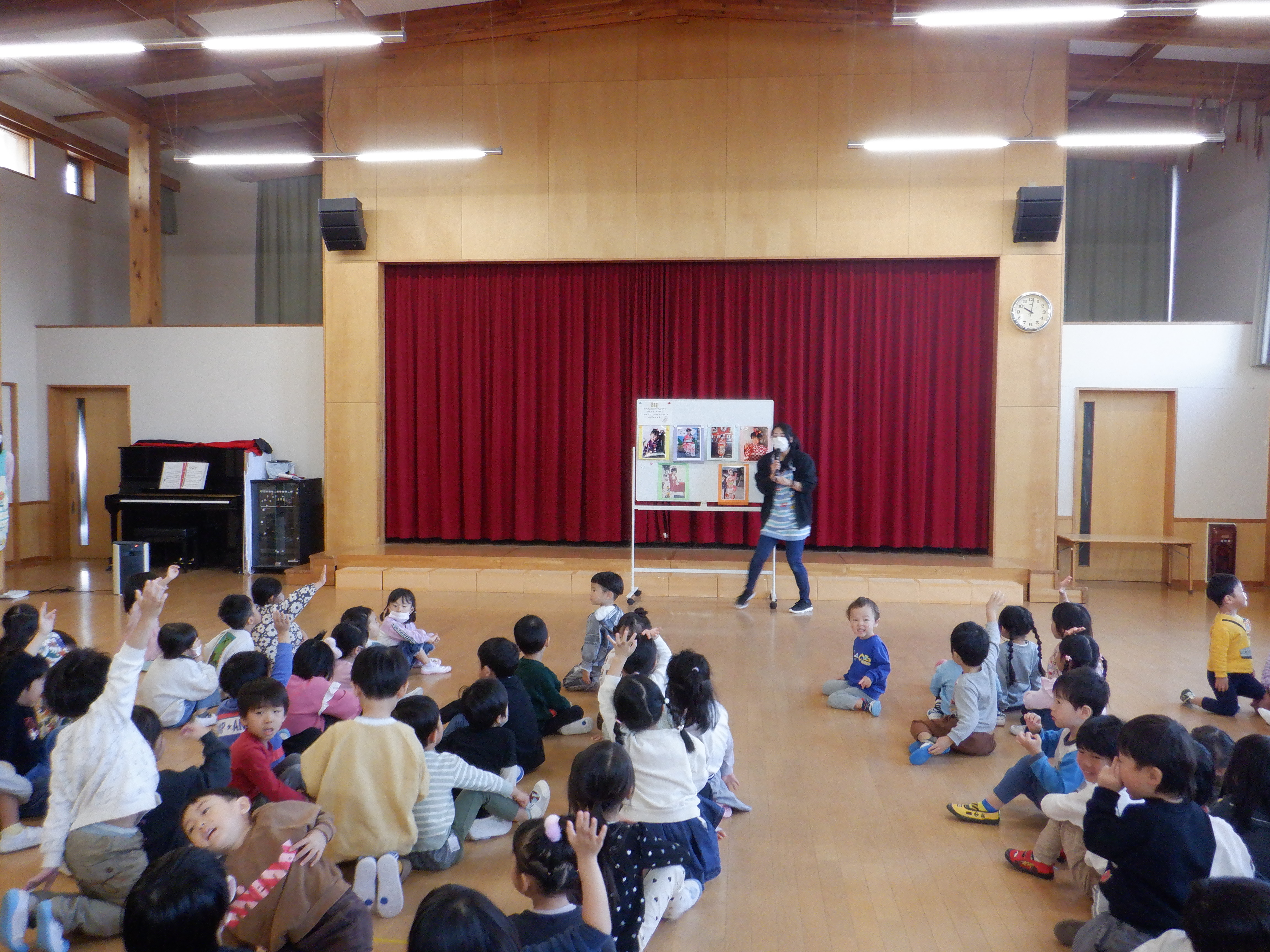 以上児組はホールに集まり、所長先生から七五三の由来を聞いたあと、クイズの正解発表。大盛り上がりでした!