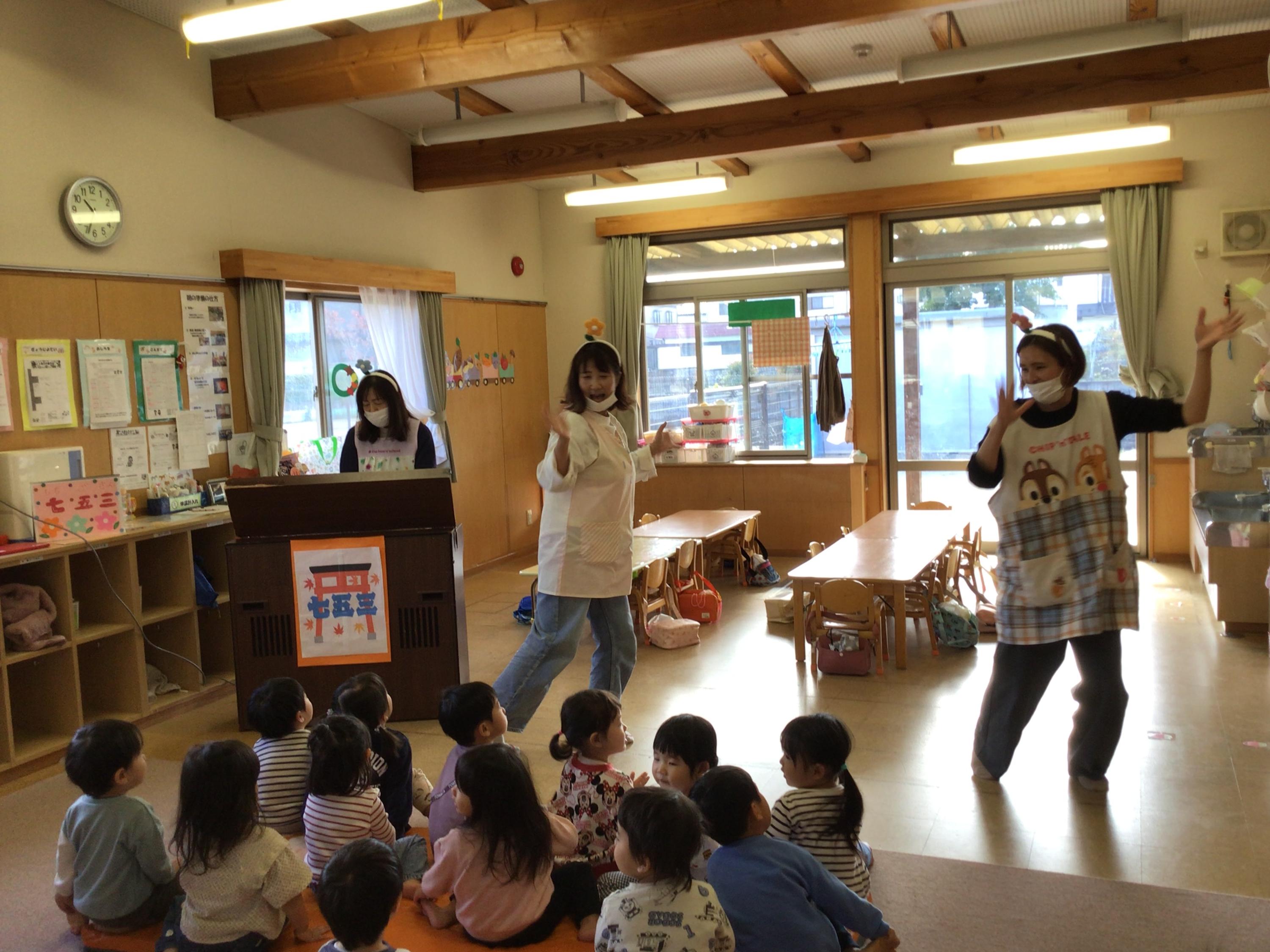 未満児では『七五三サンバ』に合わせて、先生たちが踊りを披露しましたよ。