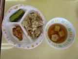 お楽しみの給食では、特別メニューの給食を喜んで食べていました。